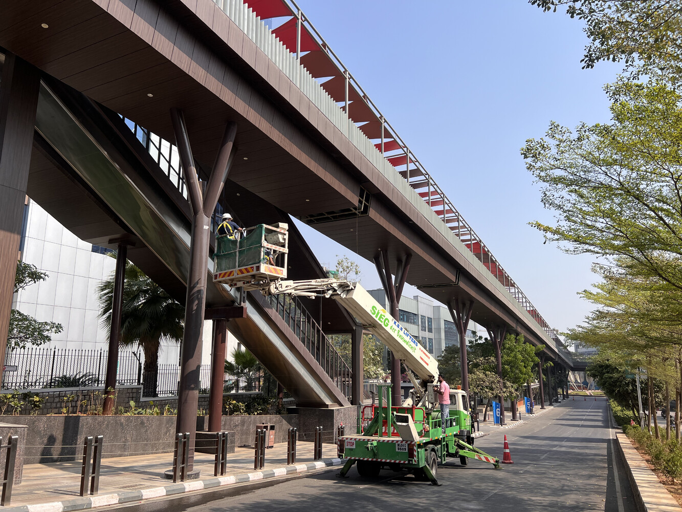Two cases of interest are worth discussing here. The first involves a walkway, also known as the boardwalk, located within a large software tech park. This structure was built to provide a safe path for employees to walk to their workplace from the nearest metro station. The walkway stands approximately 9 meters above the ground, stretches over 140 meters, and is supported by visually appealing single-post tree design columns spaced at regular intervals.